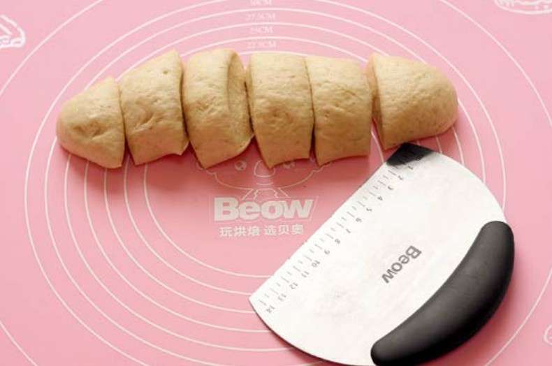 选择硅胶垫时注意选择表面光滑、有一定厚度又足够柔软的,太薄的硅胶垫在操作面团时容易粘起或者滑动,厚一些的硅胶垫在案板上抹少量水后再铺上就贴合得非常紧密,操作时不容易粘起或滑动。