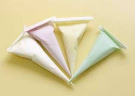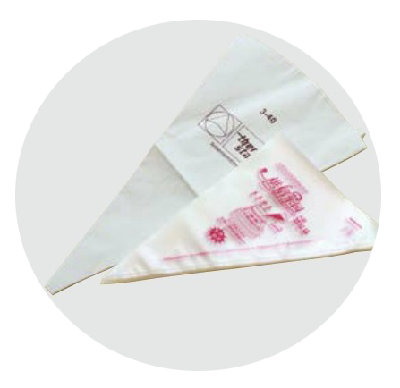 裱花袋——分塑料和布2种材质。布裱花袋可重复使用,但使用后须清洗,所以一般比较常用的是塑料的一次性裱花袋。但塑料裱花袋的强度不如布裱花袋,挤曲奇饼干这类比较干的面糊时,尤其冬天时面糊更硬,塑料裱花袋容易挤爆,所以布裱花袋也还是有必要备一个的。裱花袋也分大中小不同的型号,一般家用小号或者中号足矣,大号的很少有机会用得到。
