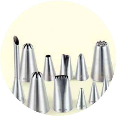 裱花嘴——利用不同形状的齿口配合裱花袋和转头可以挤出各种不同的花纹和形状,一般用来做奶油蛋糕的裱花,也可以用来挤饼干糊。