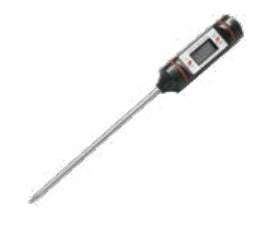 厨房专用温度计——用于测试液态食材加热的温度,如油温、水温或者巧克力糊的温度,使用时直接插入油、水或者巧克力糊里即可。切记不可用人体体温计来代替厨房用温度计,因为人体体温计的最高温度只有60℃,而厨房内需要测温的水或者油一般会超过100℃或者200℃,体温计的材质是玻璃的且内含水银,在接触高温时容易爆。水银有剧毒,如果不慎与食材接触,误食后会引起中毒。