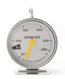 烤箱专用温度计——放在烤箱内测试烤箱内部温度用,因为需要整体入烤箱,必须经得起高温长时间烘烤,所以烤箱温度计一般整体是金属材质,面板是钢化玻璃的。切记不可用厨房温度计来代替烤箱温度计,因为测温原理不一样,且厨房温度计的柄一般是塑料的,入烤箱会烤化了。