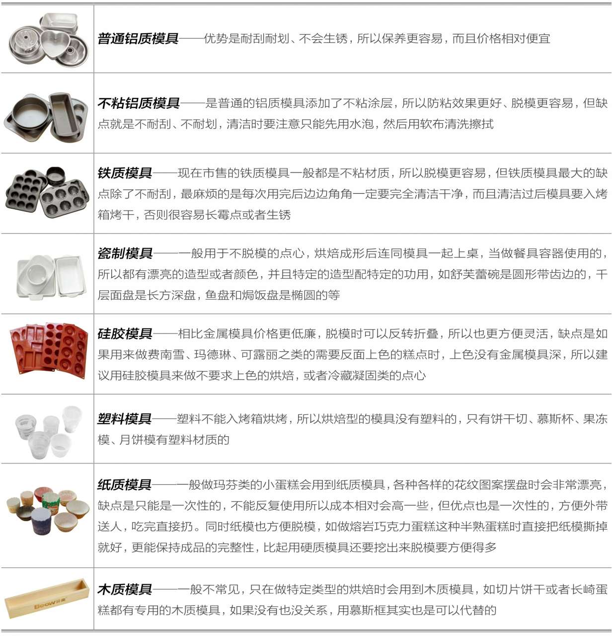 除去以上的基础模具,类似轻乳酪模具、磅蛋糕模具等,就随各人喜好和需求来配置了,想做什么烘焙就再去买什么模具,尤其对于那些很偏门的模具。如果不是经常做烘焙的“发烧友”,如果没有信心把烘焙这件事持之以恒的,就没必要置办上一大堆的模具,到头来可能只是扔柜子里。