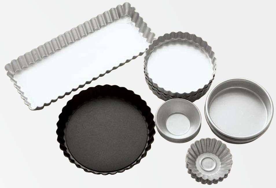 挞派模具,挞和派也是烘焙中最基础最常用的品种,挞模和派盘也有各种形状大小和材质不同的,固底活底都有。鉴于现在做蛋挞大家基本上都买半成品的冷冻挞皮,所以一般家用最必备的就是下面这种5寸圆形活底派盘,买1个基本上可以做所有品种的派,还是非常实用的。