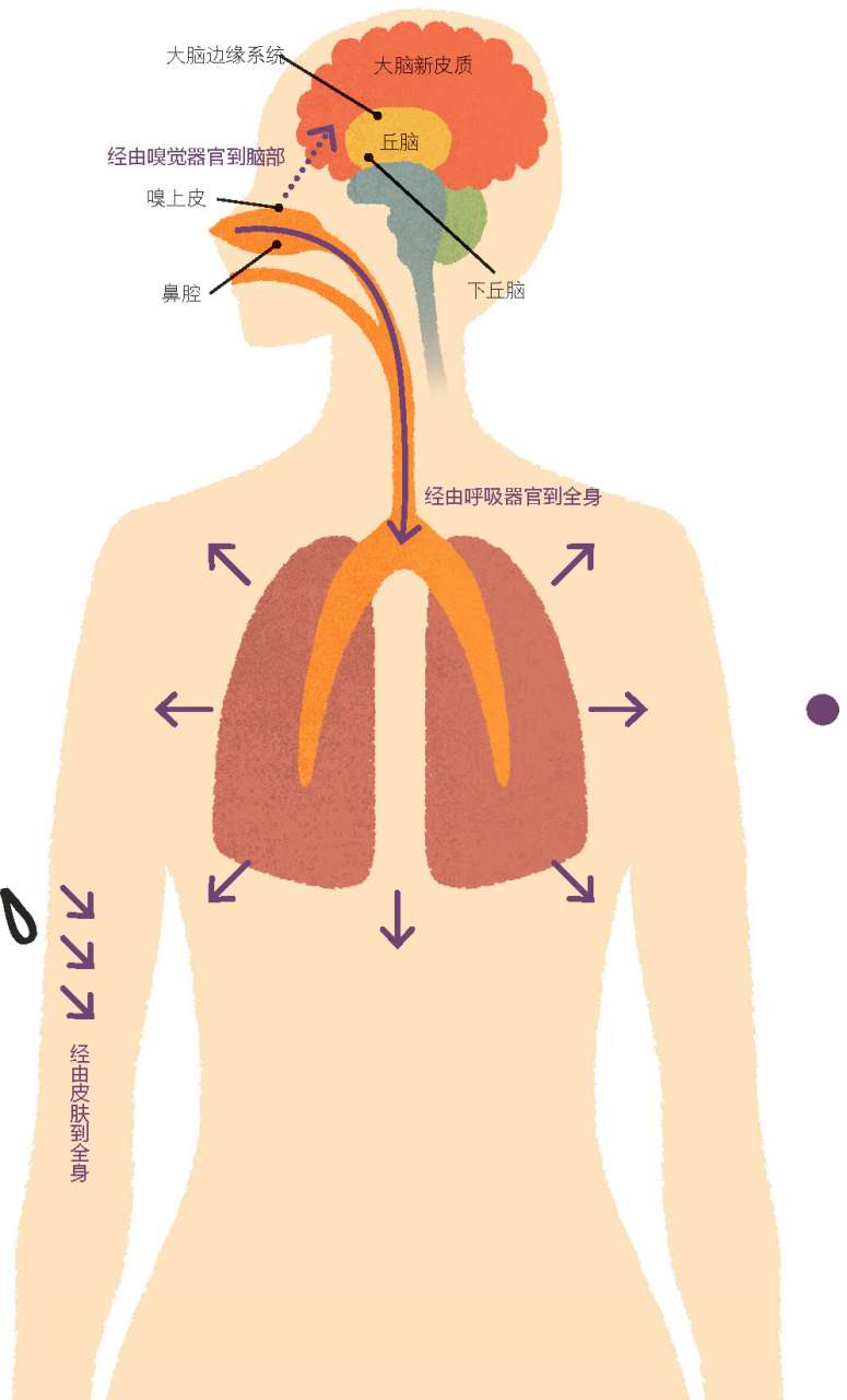 精油在人体内传递的途径可分为利用电信号传递和利用血液循环传递这两种。嗅觉器官是利用电信号的传递来影响大脑,而呼吸器官、皮肤和消化器官则是利用血液循环将精油的有效成分传递到全身。