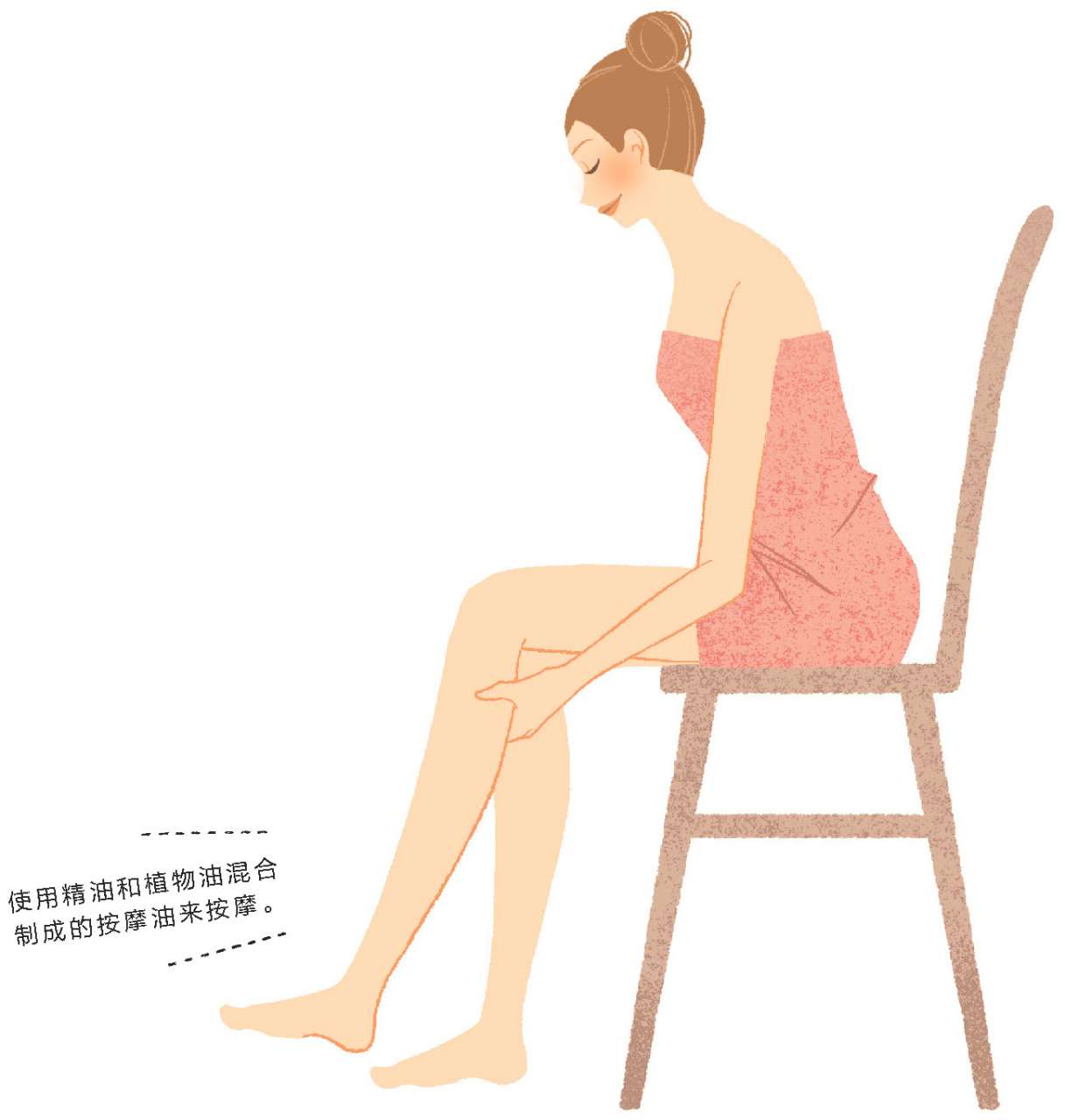 将混入精油的植物油涂抹在身体上,并进行按摩的方法,也称为护理。因为该方法可以让人从鼻腔享受香味,从皮肤吸收精油成分,所以被认为是最能够获得芳香疗法效果的方法。