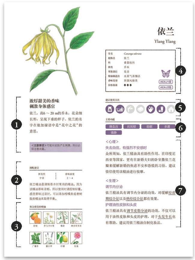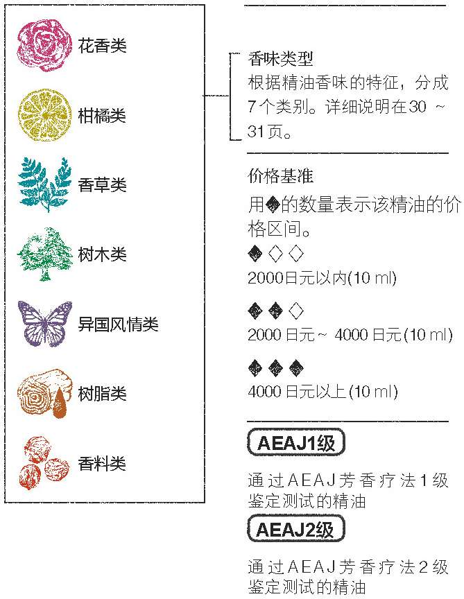用数字表示香味浓度。数字越小香味越浓,数字越大香味越淡。1是最浓的,本书中介绍的精油里,香味最淡的,数值是7。
