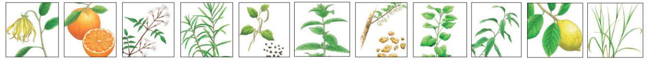 依兰/甜橙/摩洛哥茉莉/茶树/黑胡椒/胡椒薄荷/安息香/柠檬香蜂草/尤加利/柠檬/柠檬香茅