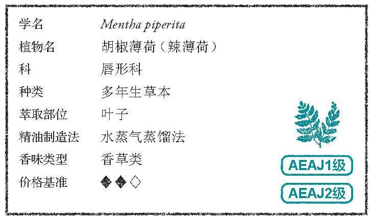 香味鲜明且有清凉感。少量精油就能够产生浓郁的香味,所以必须注意用量。胡椒薄荷精油的香味是大家熟悉的,初学者也能够完全没有抗拒感地使用。