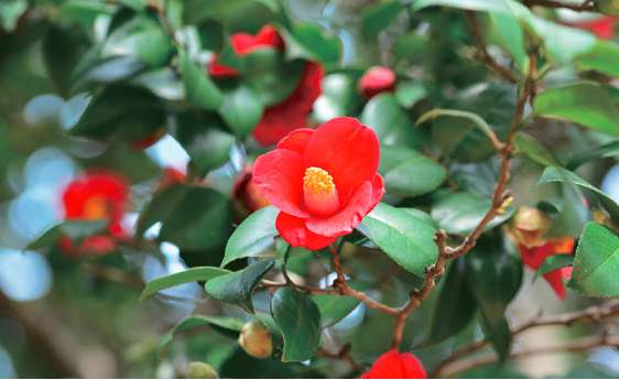 山茶树是高6m左右的乔木,从冬季到初春,绽开红色以及白色的美丽花朵,压榨山茶种子可以萃取到山茶油。日本各地都能看到山茶树,不过日本最知名的山茶产地是五岛列岛和伊豆诸岛。