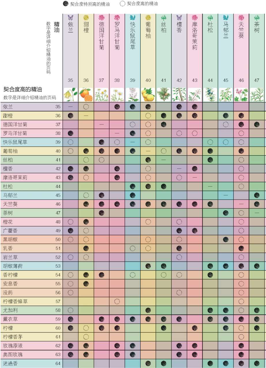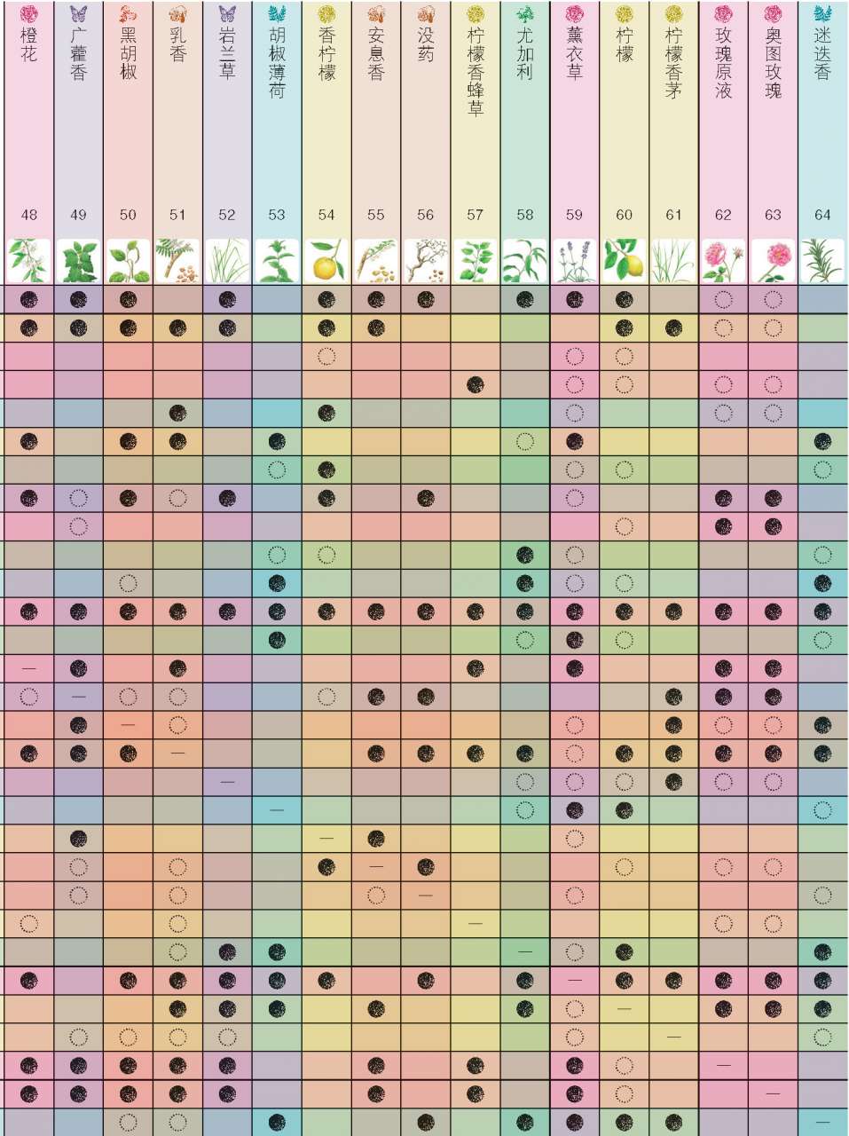 下表展示了第3章中介绍的30种精油两两之间的契合度。请参考这个表格,跟着自己的感觉选择最合适的精油,享受调配的乐趣。