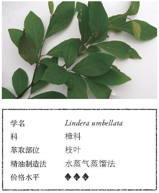 樟科植物。有着日式的高级且甘醇的香气。绿色的枝条上有黑色斑点,看起来就像是黑色的文字,故在日本,乌樟又名“黑文字”。乌樟精油含有具有良好镇痛效果的芳樟醇,能够放松身心。