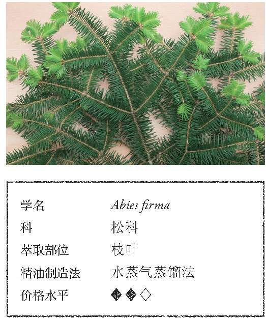作为圣诞树而广为人知。它生在高山山脊附近,采摘非常困难。日本冷杉精油有着清凉的香气,适合在提振精神时使用。它在杀菌除臭方面有很好的效果,打扫卫生时也可以使用。