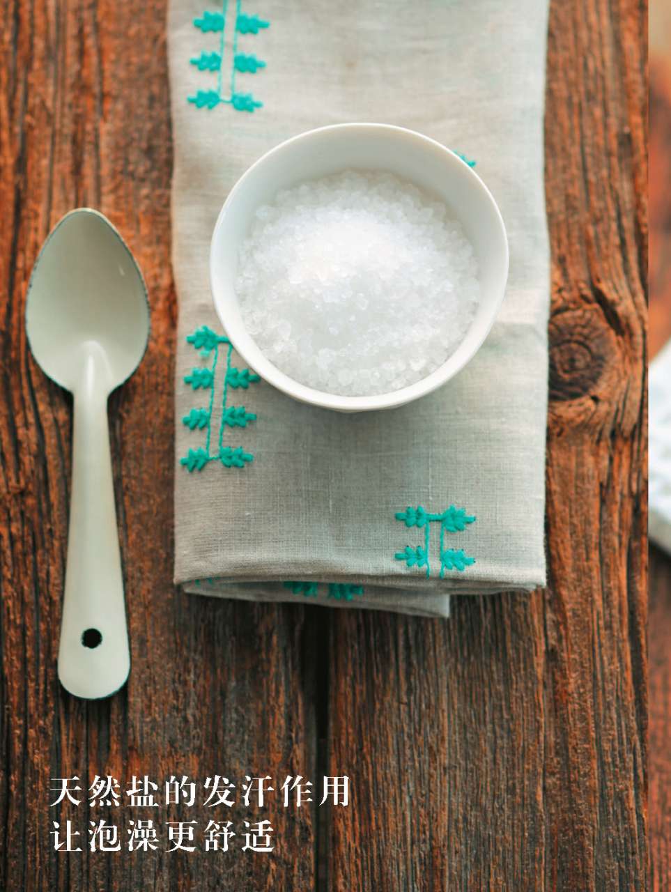 被美好香气包围的泡澡时间,能够疗愈一天的疲劳,将身心从持续紧张的工作状态切换到放松的休闲状态。天然盐具有发汗作用,也有温暖身体的功效。请混合喜爱的精油,享受泡澡的乐趣。