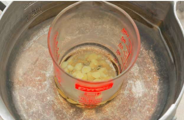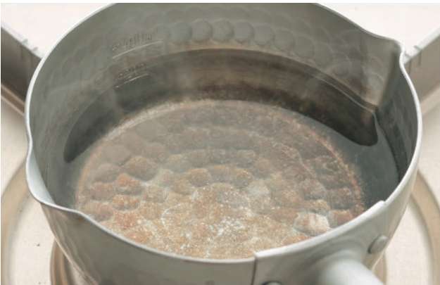 1 锅中放入可以浅浅浸泡耐热量杯的水,加热。
