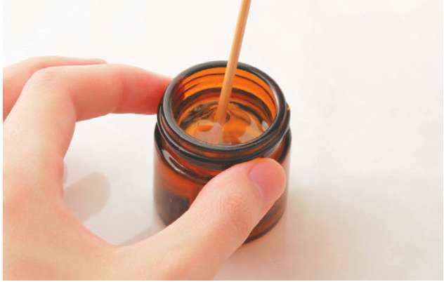 3 蜂蜡和植物油全部融化后,从热水中取出,改装到遮光瓶中。用竹签搅拌使其充分散热。