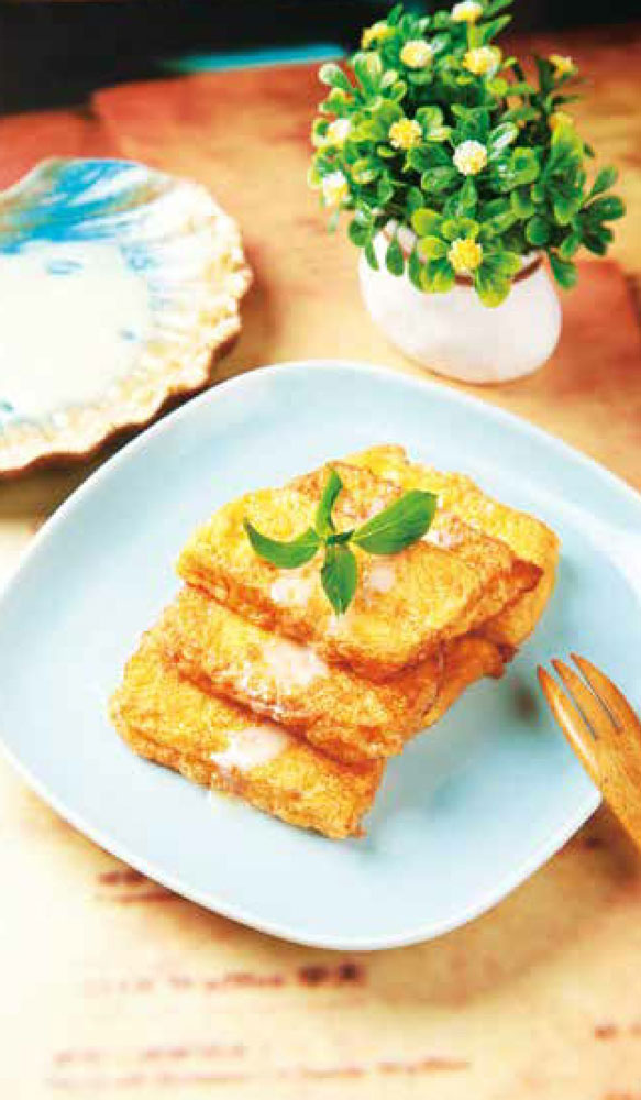 5 关火,将煎炸好的馒头片盛出,装入盘中,旁边放上炼乳,装饰上九层塔即可。