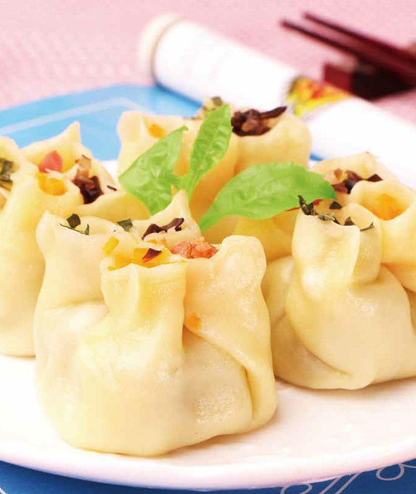 4 取馅料放在饺子皮上,收口,捏成花瓣状,制成生坯,取木耳、胡萝卜、小白菜叶和腊肉塞入花瓣里。