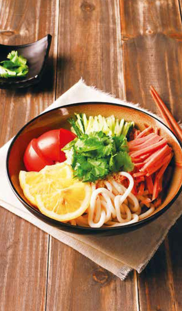 乌冬面200克,黄瓜100克,西红柿60克,方火腿100克,柠檬片8克,白芝麻15克,香菜少许,高汤50毫升
