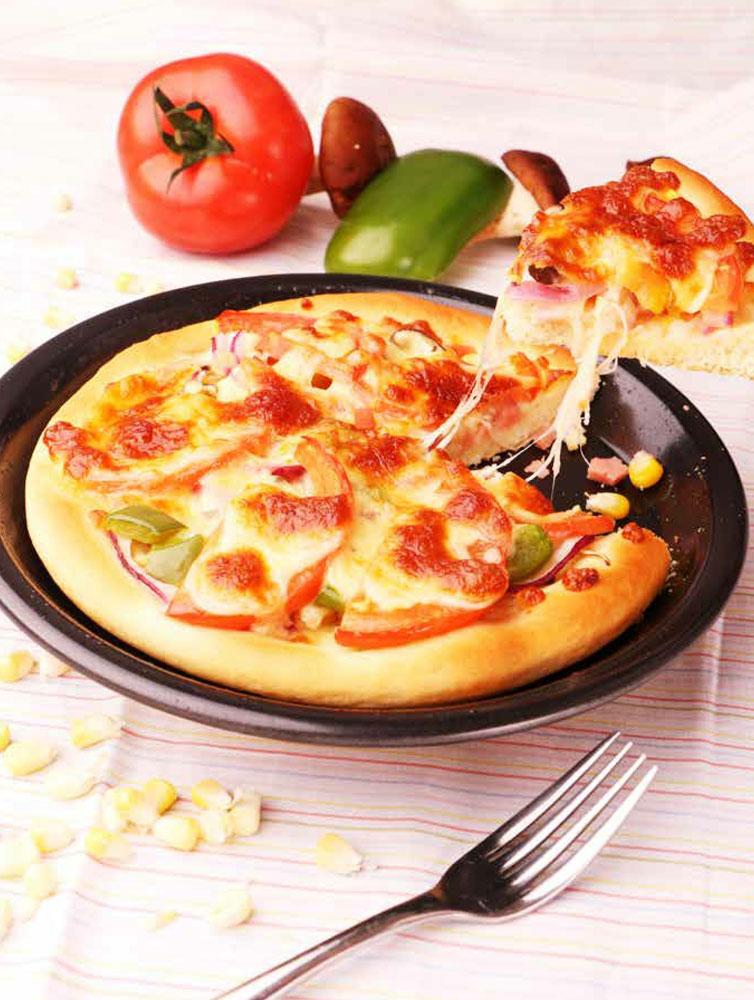 4 处理好的面皮放置常温下发酵1小时,撒入玉米粒、火腿粒、香菇片、洋葱丝、青椒粒、西红柿片、芝士丁,比萨生坯制成。