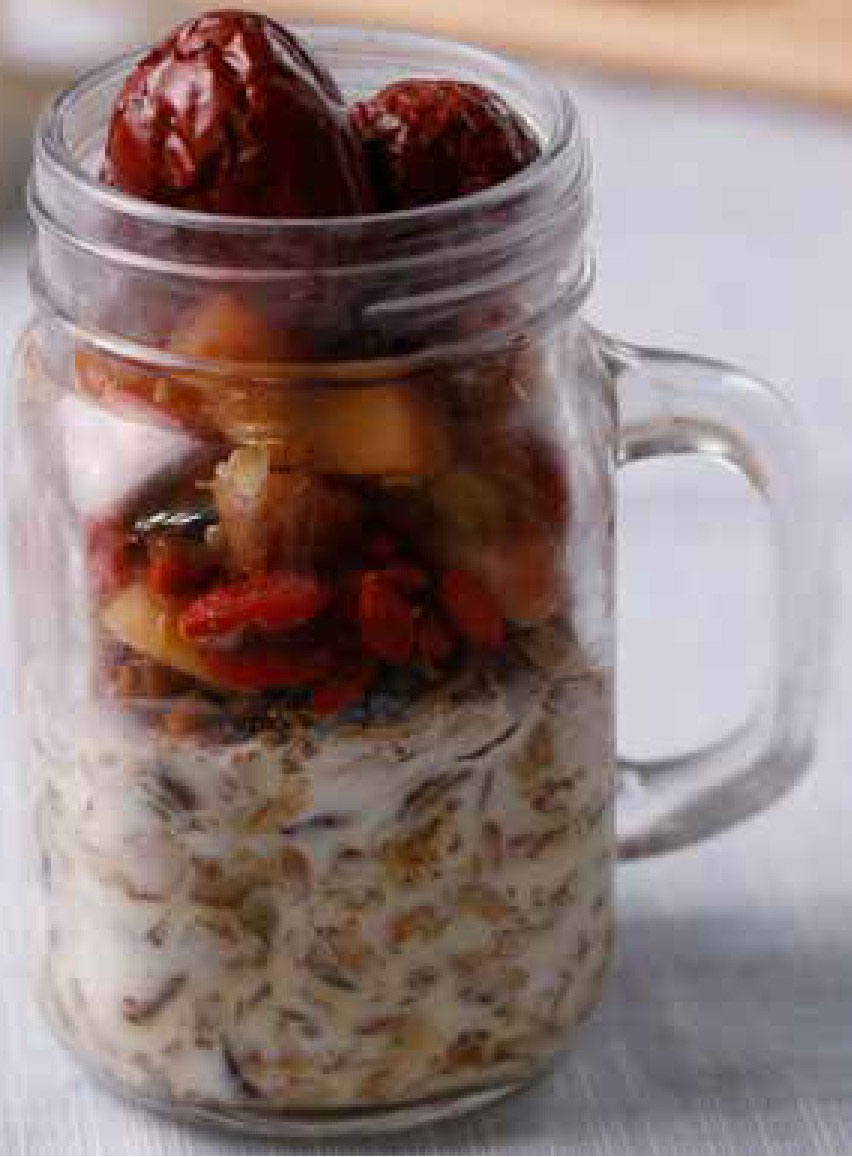 自制坚果燕麦片50克,桃子1个,酸奶适量,枸杞、红枣各少许