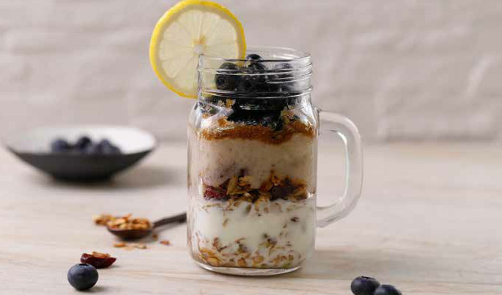 3 准备1个杯子,依次放入自制坚果燕麦片、酸奶、香蕉泥、小麦胚芽、枫糖浆、蓝莓、柠檬片即可。