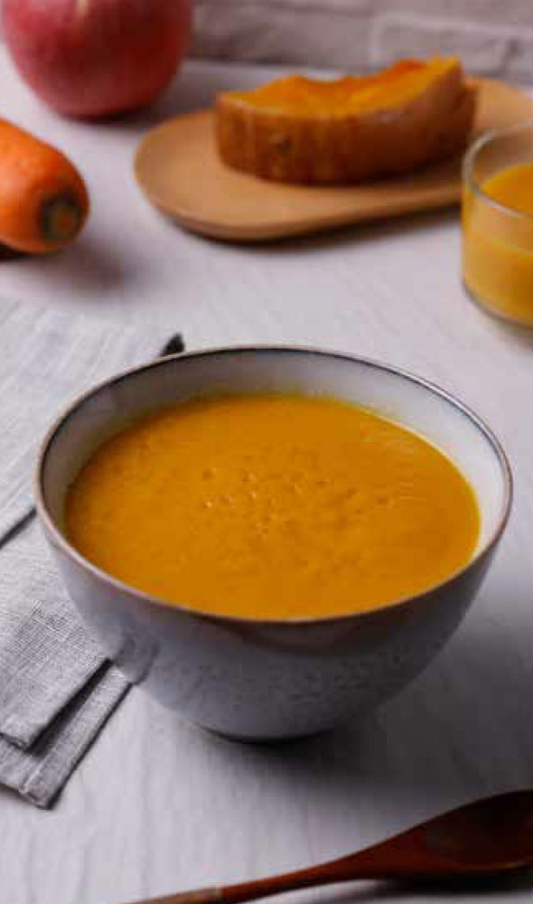 3 将蒸好的南瓜、山药、胡萝卜,以及苹果、牛奶、姜黄粉一同放入料理机内中速搅拌30秒,搅至顺滑即可。