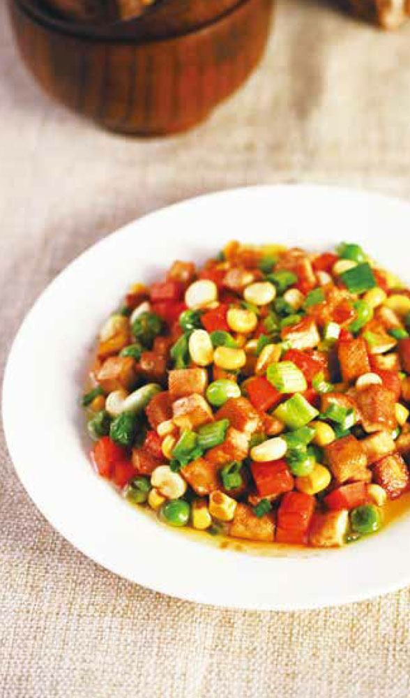 4 用油起锅,放入部分蒜末爆香,加入香干丁翻炒1分钟,加入青豆、鲜玉米粒、胡萝卜丁,炒匀后加盐调味。