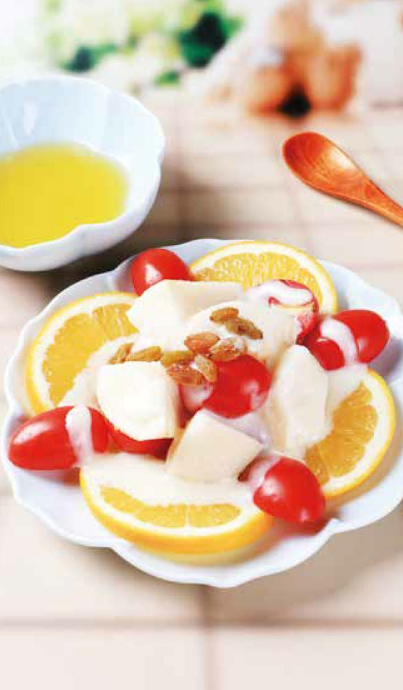 圣女果150克,橙子200克,雪梨180克,酸奶90克,葡萄干60克