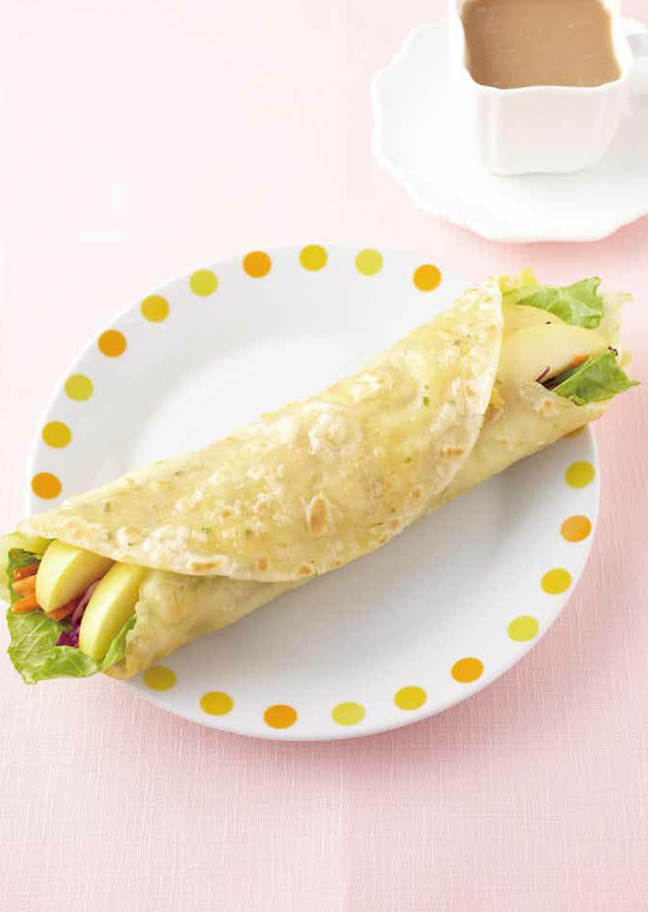 做蔬果蛋饼时,煎蛋饼皮不要加太多油,最多用1/2茶匙的油就足够,甚至不加油用小火慢煎,蛋饼皮就不会太硬或烧焦。