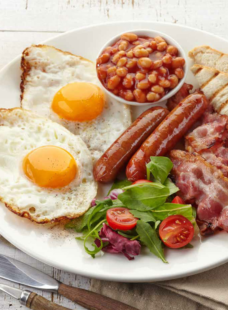 吐司1片,鸡蛋2个,香肠、培根各适量,黄豆100克,西红柿1个,芝麻菜1根,紫甘蓝1片,圣女果2个,黄油20克,牛至香草少许