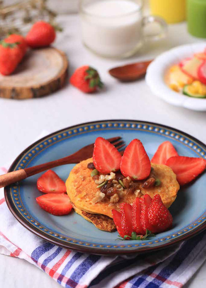 2 南瓜小饼上方或周围撒上混合坚果果干及草莓装饰,也可淋上蜂蜜调味。