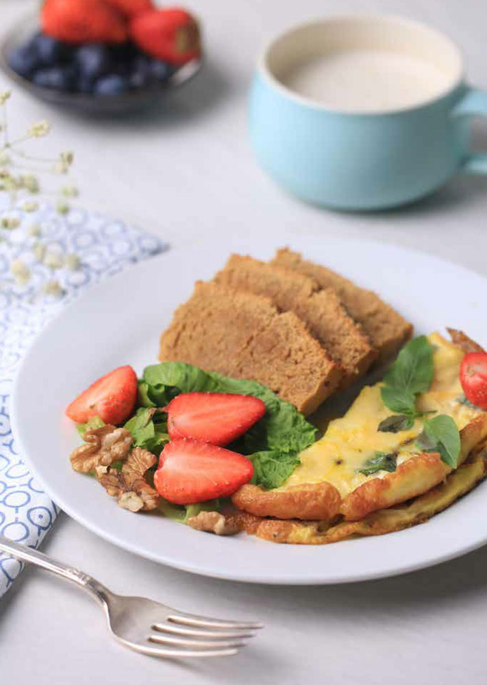 1 将红枣磅蛋糕、罗勒马苏里拉煎蛋摆入盘中。