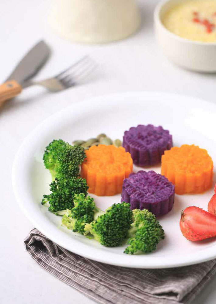 西蓝花适量,紫薯1个,南瓜1块,鸡蛋1个,草莓适量,小麦胚芽30克,南瓜子20克,红枣3颗,枸杞6颗,炼乳1勺