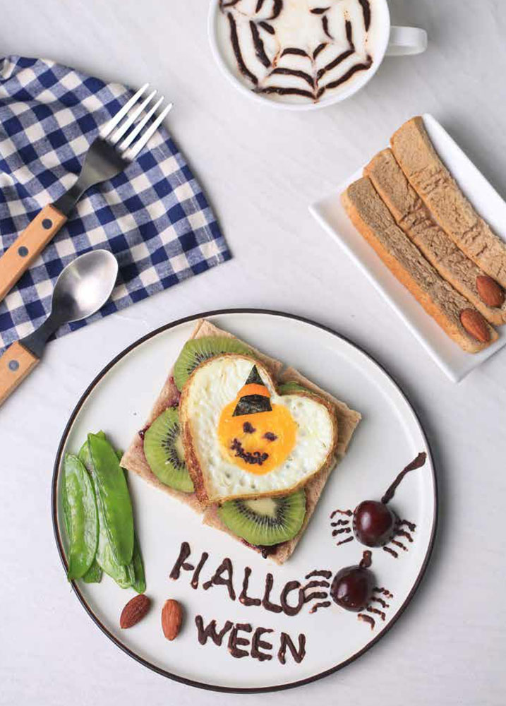 3 在盘边写上HALLOWEEN,还可以随手画几个小鬼脸。
