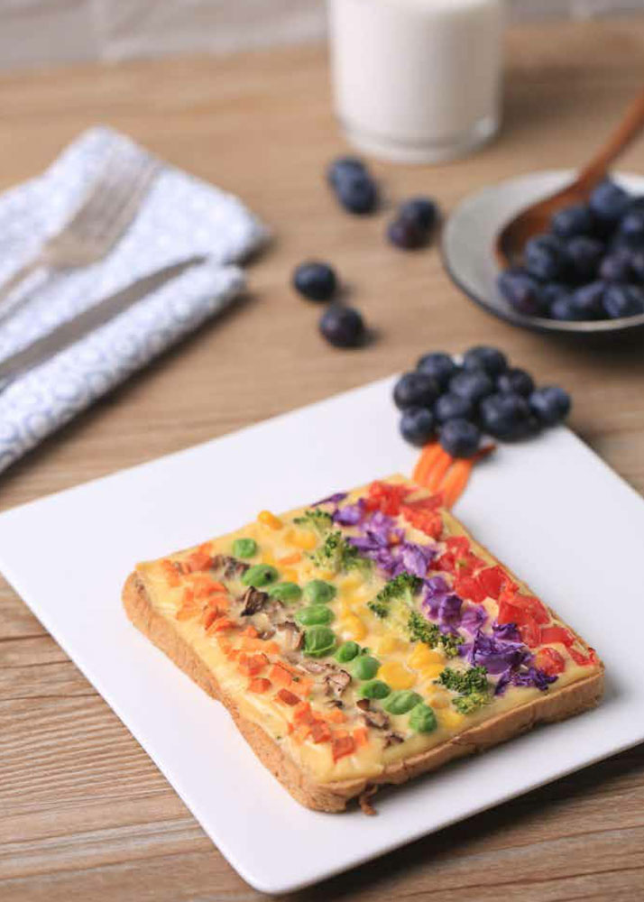 全麦吐司片2片,马苏里拉芝士片3片,青豆粒、玉米粒各1把,紫甘蓝3片,西蓝花4朵,胡萝卜半个,口蘑1个,圣女果5个,蓝莓1把,牛奶2杯