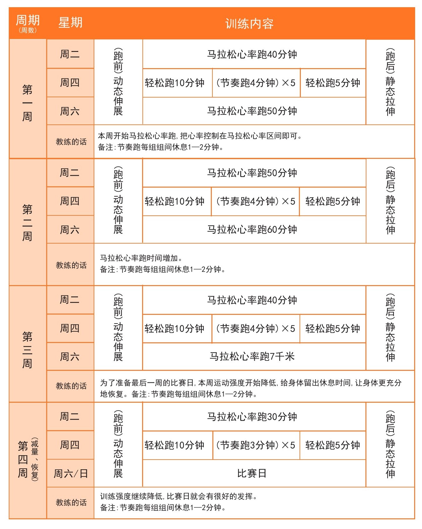 这个训练阶段把心率保持在用上述公式算出的区间内就好。如果心率低于马拉松心率跑心率就快一点,如果超出马拉松心率跑心率就速度慢一点;状态好就保持在马拉松心率的上限,状态一般就保持在下限。